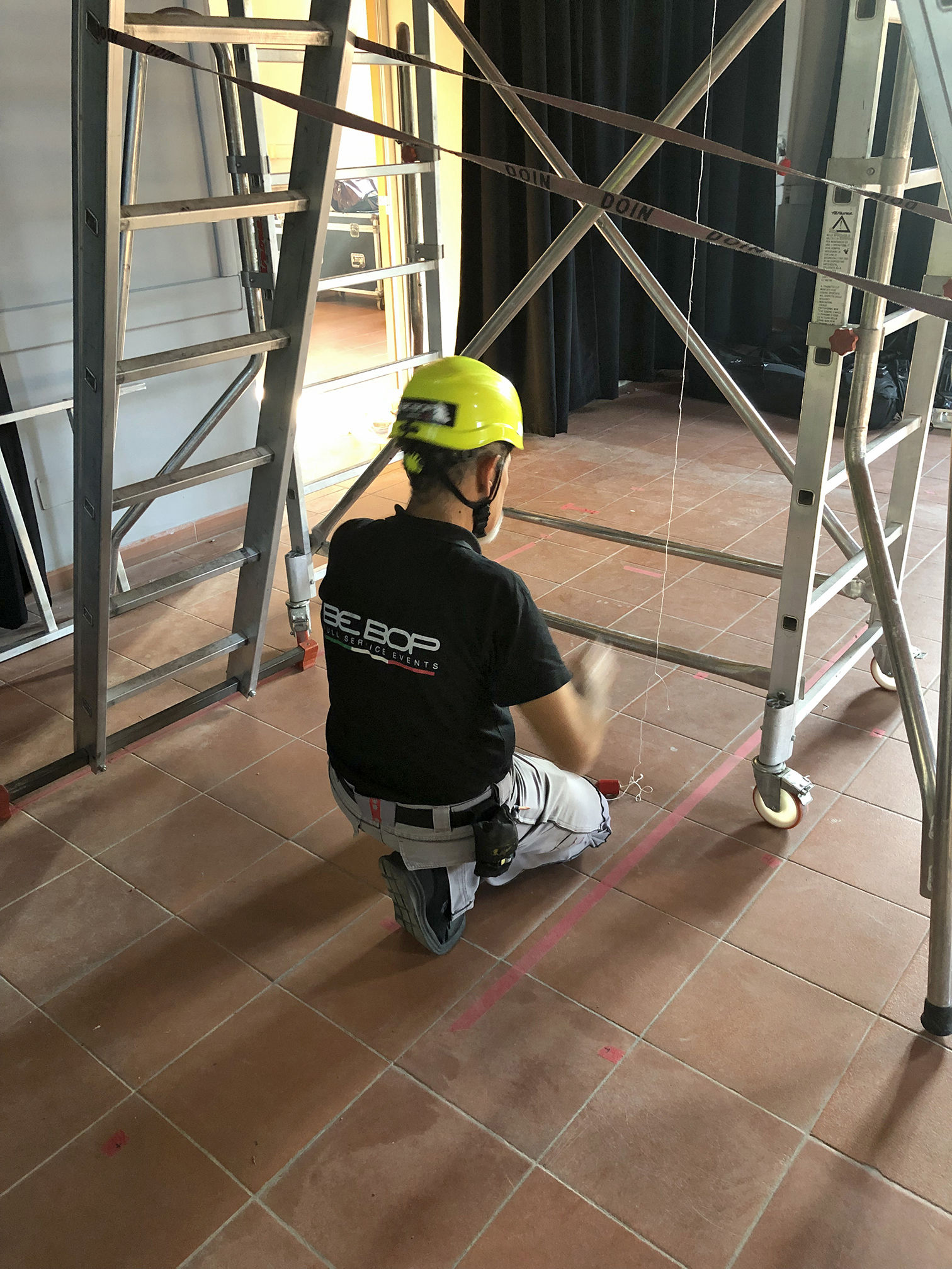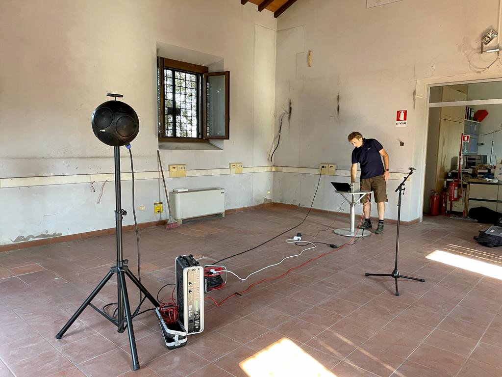 acustico 380 gr/m2, pannelli fonoassorbenti installati a baffle, tappeto in moquette, porte fonoisolanti tutto vetro).