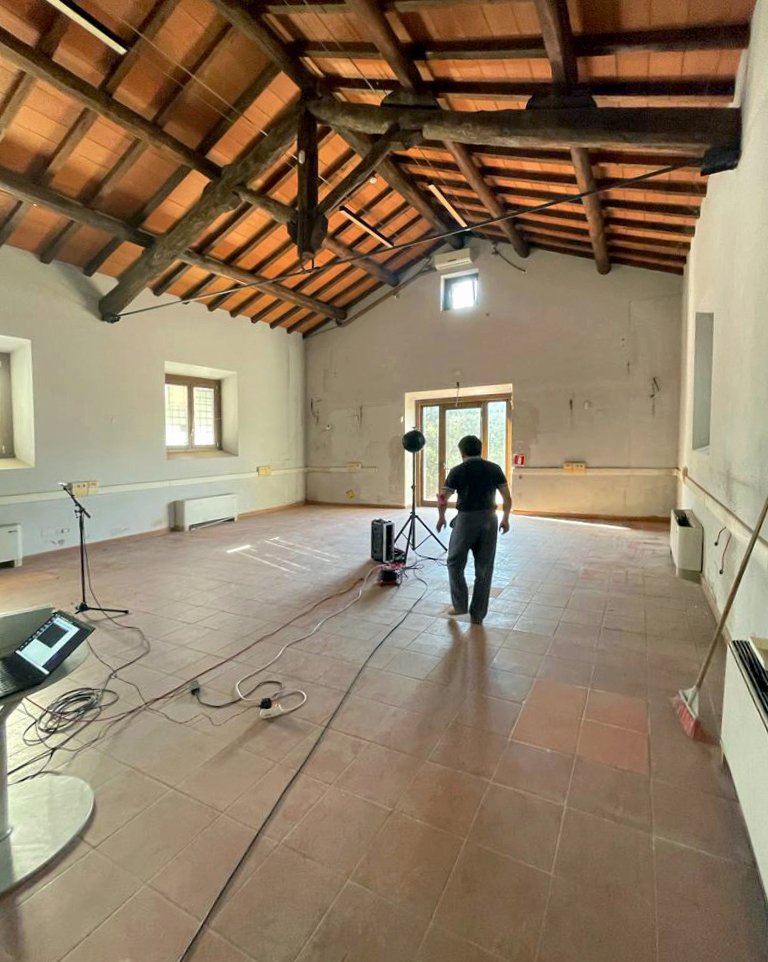 Allestimento-trattamento acustico fonoassorbente con porte fonoimpedenti per una grande sala di ripresa (tendaggio perimetrale in tessuto di velluto nero